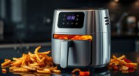 You’re curious about how energy-efficient the newest air fryer models are in 2025. I’ve found that these models use advanced technology to minimize power consumption while still delivering great results. They often have smart features to optimize cooking times and temperatures, saving energy. Overall, they’re more eco-friendly than earlier versions, helping you cook efficiently without wasting electricity, which is great for your wallet and the planet.