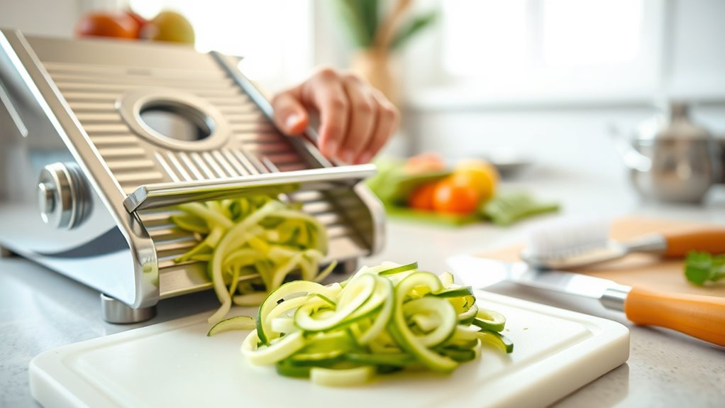 Using safety gear is essential for protecting your hands while slicing with a mandoline. It markedly reduces the risk of cuts and injuries during food prep. Always wear a cut-resistant glove or safety guard to provide hand protection, especially when working quickly or with dull blades. Use the included food holder or safety guard to keep your fingers away from the sharp blade, preventing injuries. Proper hand positioning, with fingers curled inward and knuckles guiding the food, enhances safety. Keep your hands dry and clean to guarantee a firm grip, reducing slips. Regularly inspect your safety gear for wear or damage and replace as needed for maximum protection.